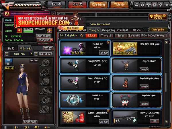 + 43Vip: K98 Blue + Awm Hark + 3z Iron víp + 3z BB + M4a1 Trans + Ngọc trinh