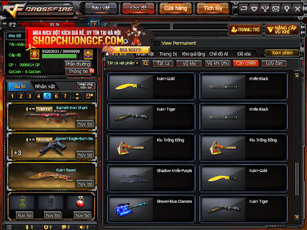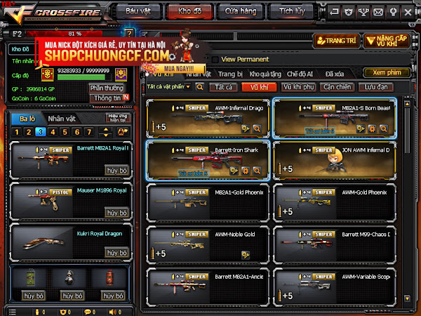 + 34Víp: Full 10th + 3z BB + Amw víp + M4a1 Trans + X7 Lục víp + 3z Iron + Ngọc trinh