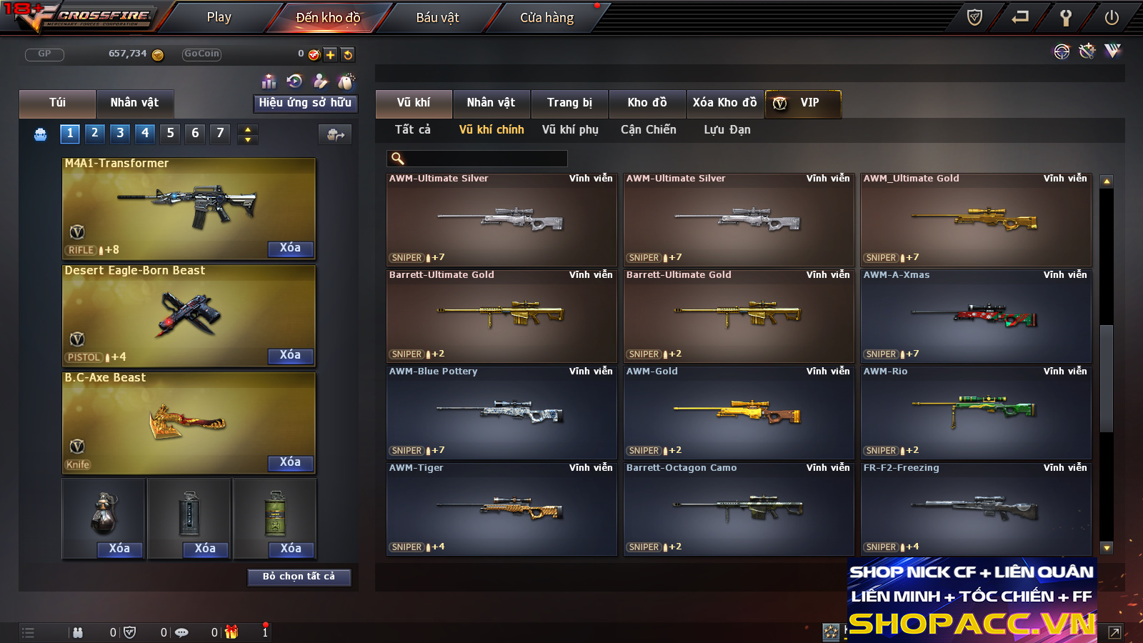 + 10Víp: M4a1 Trans +AK47 Víp + Sét Quan Vũ + AWM Víp + Ngọc Trinh + Athena